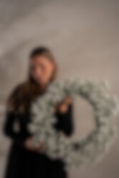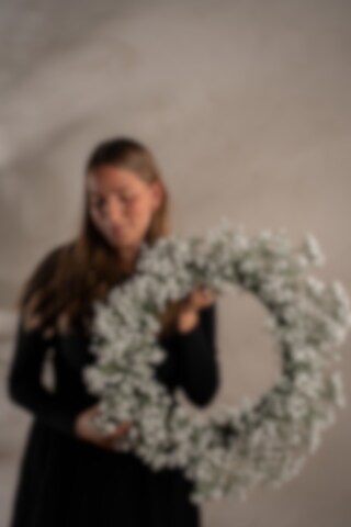 Denna krans med brudslöja är 55 cm i höjd och ger ett mjukt, romantiskt uttryck. De små vita blommorna skapar en känsla av lätthet och elegans, vilket gör kransen idealisk för bröllop, dop eller som en vacker dekoration året runt. Passar både som väggprydnad och dörrkrans.