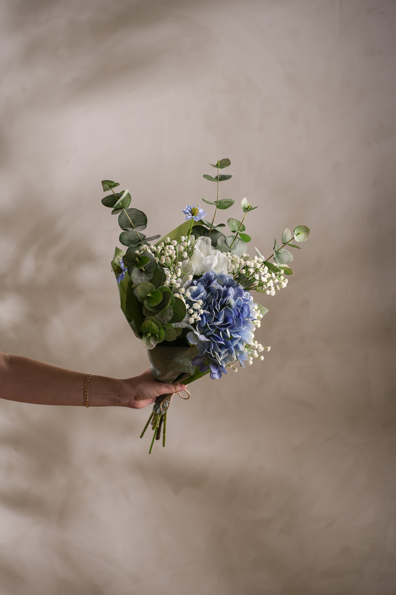 Nova kombinerar hortensia, anemon, eucalyptus, nigella och brudslöja i en sofistikerad komposition. Fylliga blommor blandas med lätta, luftiga inslag som ger en ren och harmonisk känsla. En modern bukett som skapar lugn i alla miljöer och aldrig kräver helt underhållsfri.