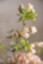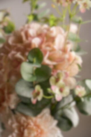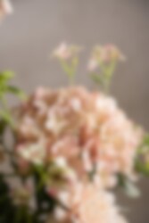 En harmonisk bukett i mjuka toner med hortensia, dahlia, pensé, enkianthus och eukalyptus. Kombinationen av fylliga blommor och luftigt grönt skapar ett levande och välbalanserat uttryck som passar både moderna och klassiska miljöer. Helt underhållsfri och enkel att placera.