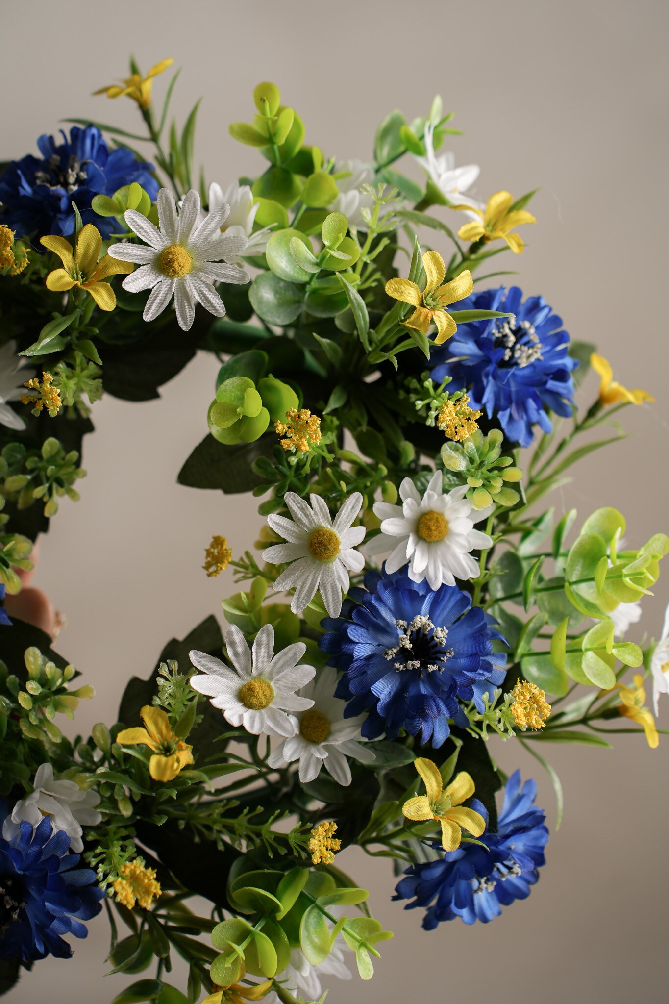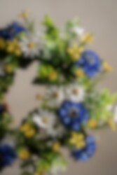 Sommarkrans i flera färger, 35 cm i diameter. Låt hemmet blomstra året om med denna livfulla krans i blå toner. Passar lika bra på dörren som på väggen eller som bordsdekoration.
